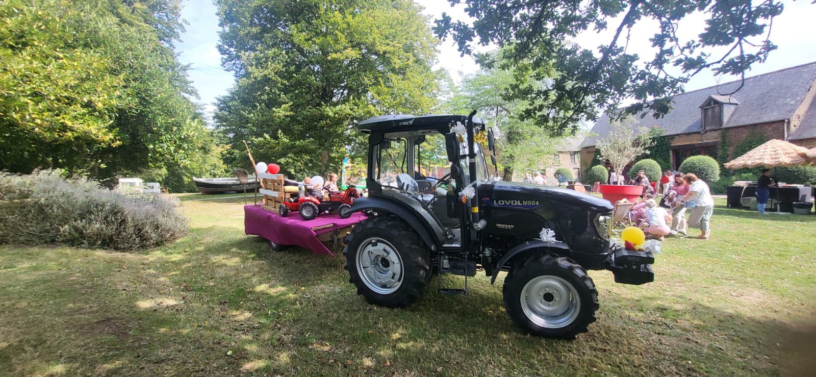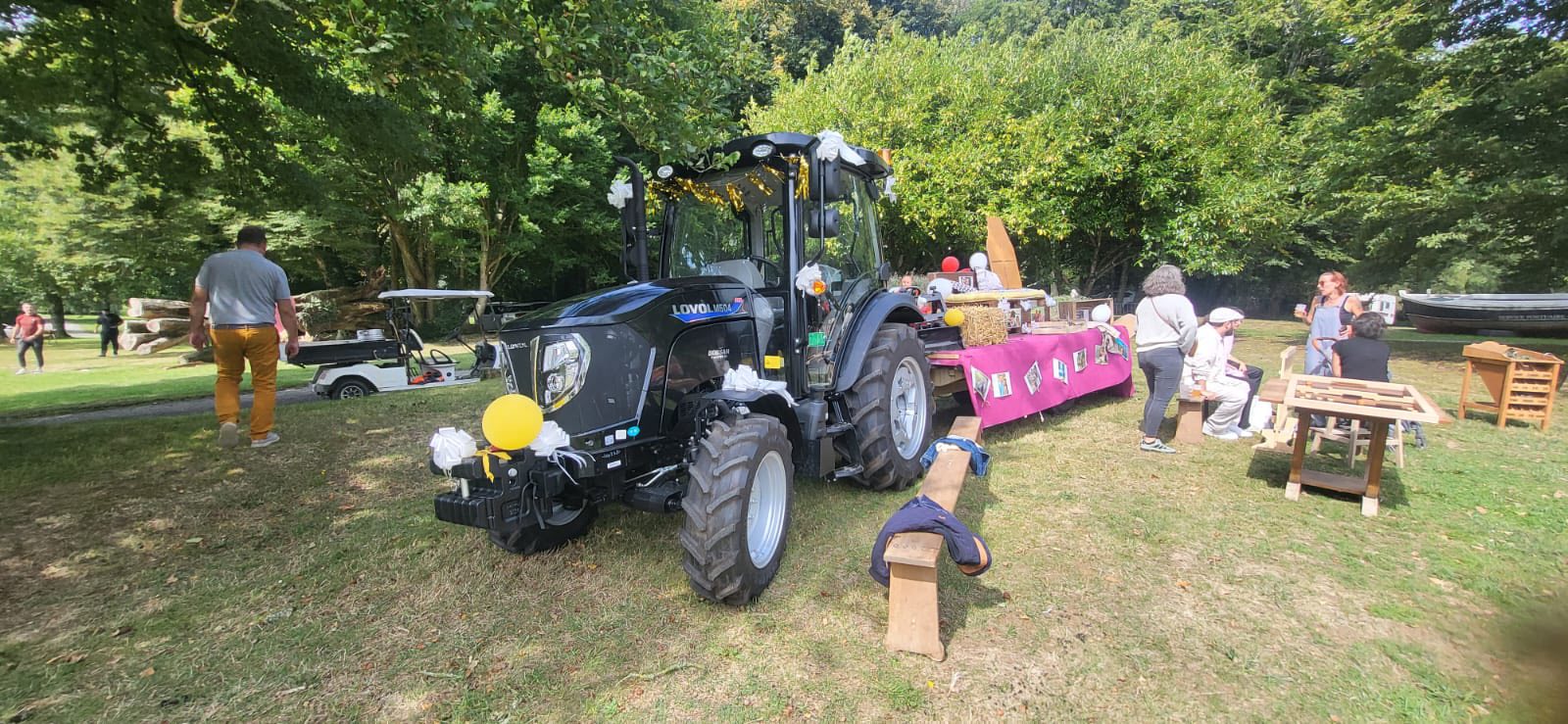Le LOVOL 504 PRO noir, habituellement dédié aux travaux de la ferme, a été transformé pour l'occasion en un char nuptial spectaculaire. Orné de ballons blancs et jaunes, de guirlandes lumineuses et de décorations florales, le tracteur a dignement mené les festivités. Une petite remorque aménagée et décorée, servant de plateforme pour les jeunes mariés et leurs invités, complétait ce convoi champêtre.